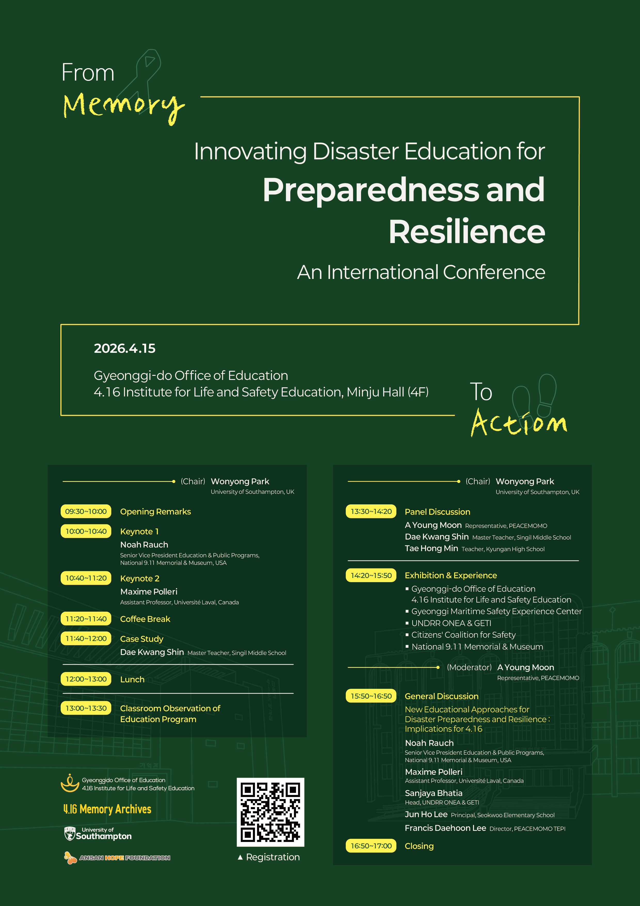 이번 학술대회는 재난대비 및 회복력 강화를 위한 혁신적 재난교육(부제: 기억에서 행동으로)을 주제로 진행됩니다.